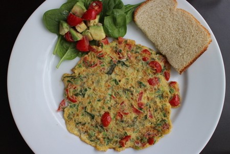 これが普通のオムレツと違うところは、うっすらのばしてあることでしょうか。主な材料はトマト、ネギかタマネギ、チリペッパー、香菜、スパイスで、写真より材料を細かくきるともっと奇麗に出来上がります。そのまま室温で食べてもでもサンドイッチにしてもおいしいので、時々お弁当に入れることがあります。写真のお弁当はこれにトマトとアボカドのサラダとナンが添えてあります。手抜きですが、人気のあるお弁当の1つです。