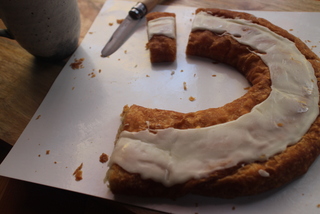 Kringle / クリンゲルというのは北欧の菓子パンで国によって多少の違いはあるようですが、TJ’sで扱っているのはデンマーク系アメリカ人が作っているもので、デンマーク系の移民が多いウィスコンシン州の有名なベーカリー、O&H Danish Bakery という店からのお取り寄せ商品です。何十種類とある中のフィリングの中からアーモンドがセレクトされ、TJ’sで期間限定で販売されています。余談ですが、以前シカゴに住んでいた時に(ウィスコンシンの隣のイリノイ州にあります)クリンゲルのことは聞いたことはあったのですが、とにかくスイス、ドイツ、ポーランドといろいろな移民が多いウィスコンシンはこういった名物が比較的多くあり、クリンゲルまでは行き着けずにシカゴを後にしたのでした。